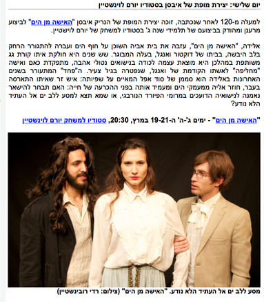 “The Lady from the Sea” is a poetic, dreamy and vibrant drama brought to stage in an abridged new and current adaptation to Ibsen’s classic masterpiece. Noam Shmuel, the play’s director, has been directing plays for Israel’s “Cameri” Theater (“Games in the Backyard, Gaza 17, Romeo & Juliet and more) and also serves as Artistic Consultant to Omri Nitzan, the manager of the theater. In the past he has directed for the Studio successes such as “Vulkan Junction” and “Bachelors & Bachelorettes”.